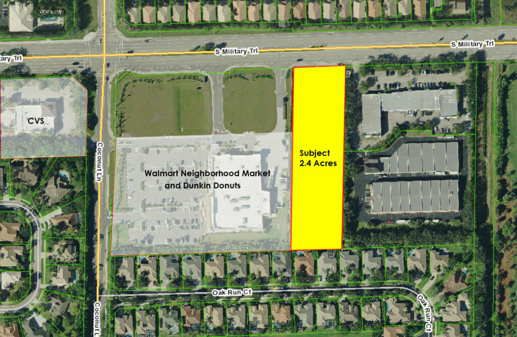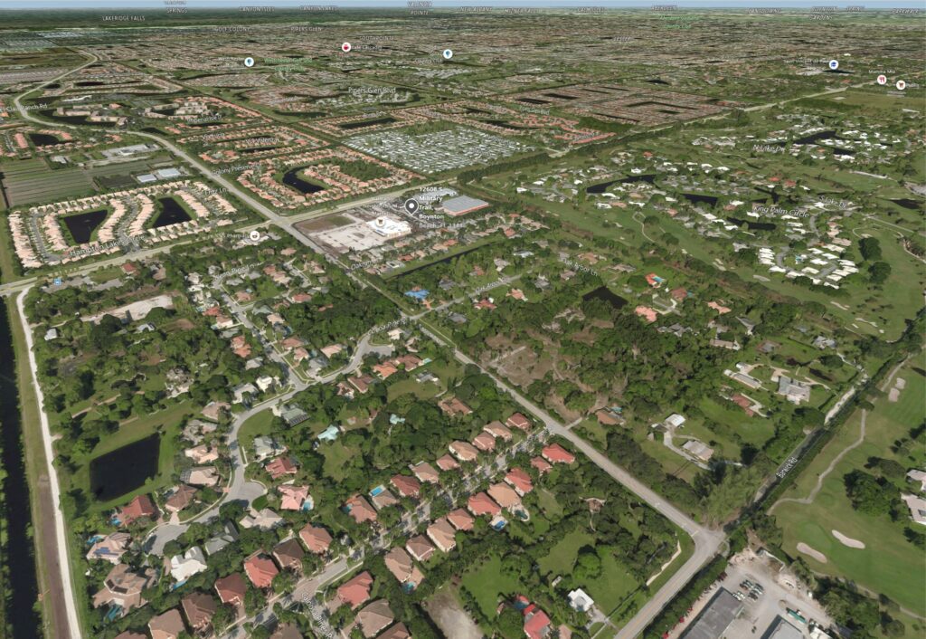 Ideal uses include Self-storage, Retail, Office, Professional/Medical, Warehouse/Distribution, and Auto Sales. Located in the heart of Boynton Beach country clubs and golf courses, this site is Current Land Use Codes include AG; with rezoning to CH/5 (CU, CG). Under new zoning codes, and in combination with variances, it’s possible to build over 94,000sf of building, up to almost 40ft tall. Per Palm Beach County, there may also be an option to join the subject site with the adjacent Walmart site for increased density. The site is surrounded by country clubs and a short drive to the ever-popular Atlantic Avenue in Delray Beach. East to reach from 95 and Turnpike.