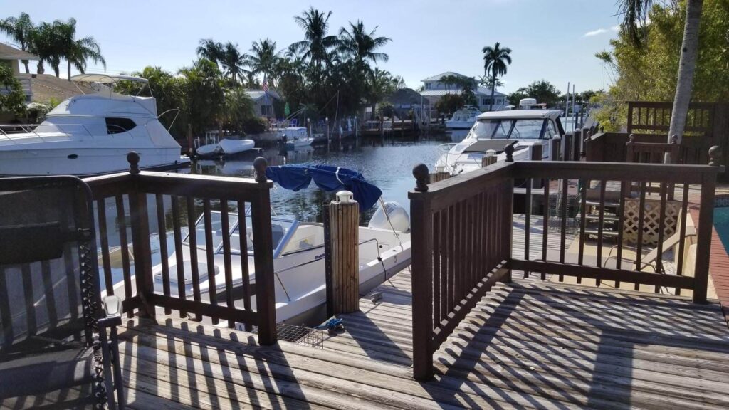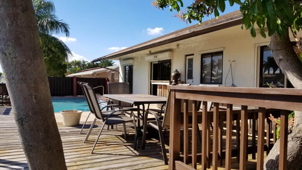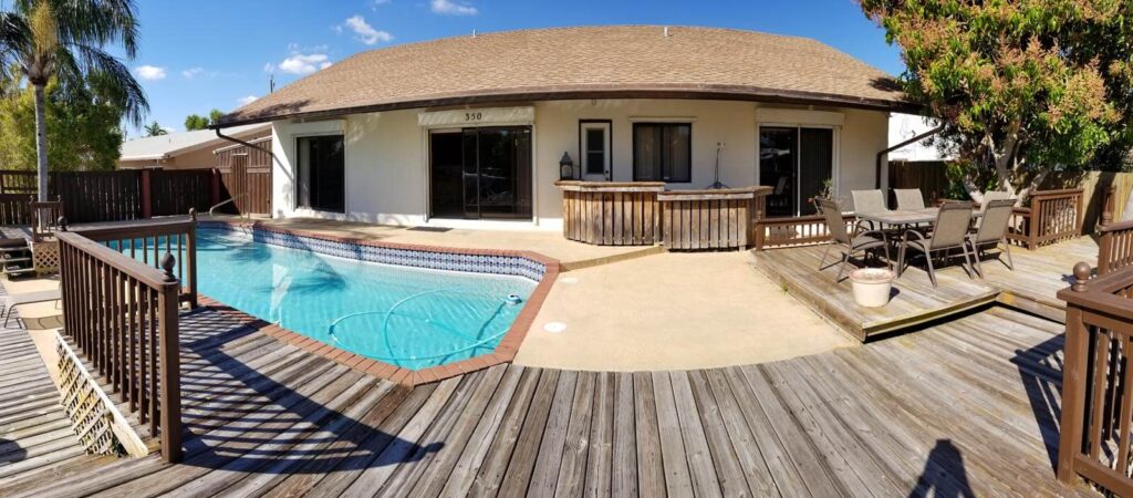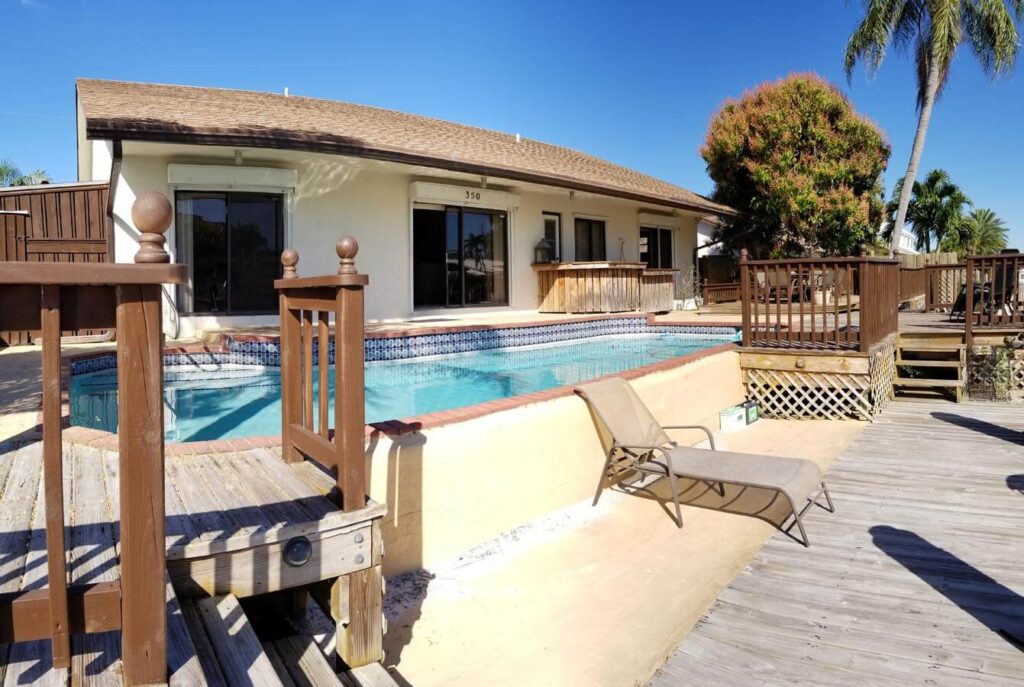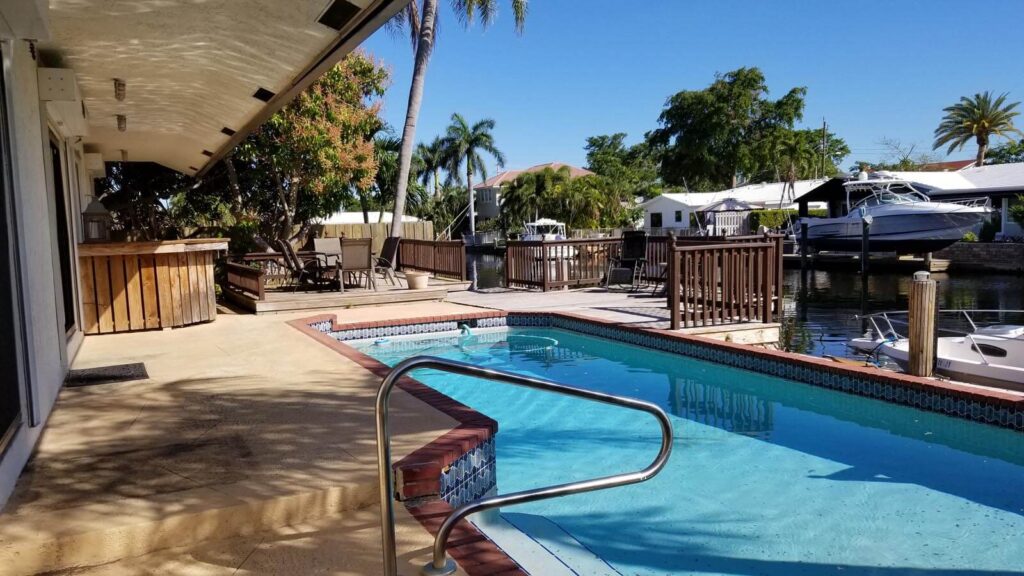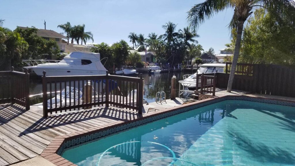 Amazing 4/3, Water-front Pool Home, 80ft Dock, deep water canal. Master suite + guest suite. 15×30 pool, diamond-brited, surrounded by a stamped-concrete patio, multi-tier wood deck w/ eating/sitting areas + boat dock. Outside shower + a bar, great for entertaining. Open floor plan w/ huge sitting areas, huge bedrooms, even an eat-in bar. Tons of storage & large pantry. Like gas? You’ll love this kitchen. Propane tank outside. Jacuzzi tub in the master bath, master bed looks out onto the poo. Huge closets & full laundry area off the kitchen. 20×20 tiles in the living areas & laminated wood in bedrooms. The property is elevated & has hurricane shutters. Family-friendly neighborhood w/ access to shops, restaurants and more. Walk, bike, boat or spend the day on the ocean/intracoastal.